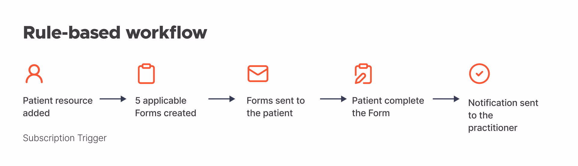 The workflow begins when a new Patient resource is added. This event triggers five forms to be created and sent to both the patient and the practitioner. The engine waits until the patient fills in the forms. Once all the forms are completed, this event immediately triggers the notification to be sent out to the practitioner.