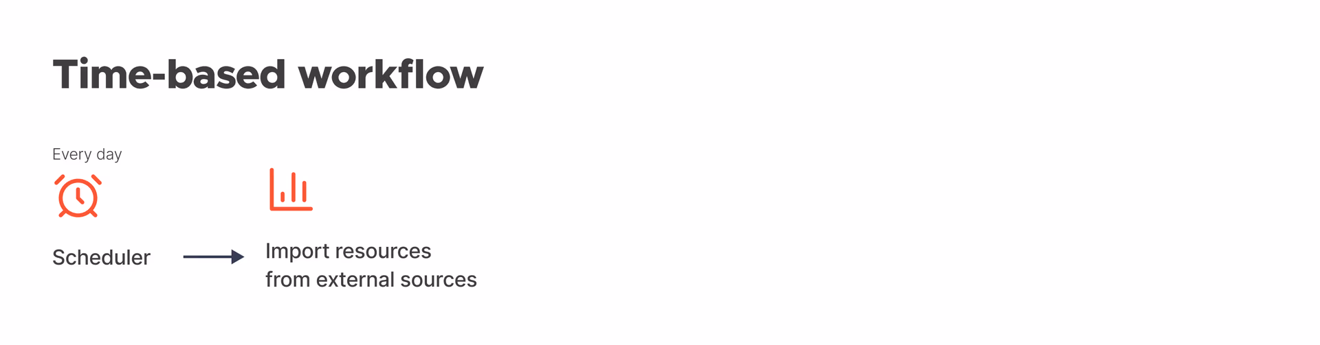 In the above example of the scheduled workflow, the process initiates daily and imports all resources stored in S3 storage, ensuring the regular and automated transfer of data.