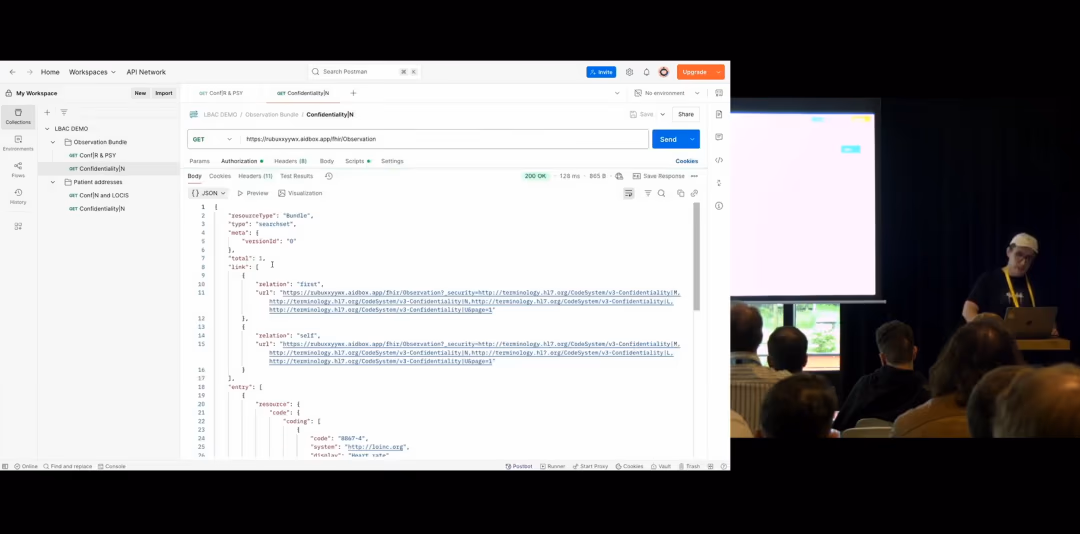 Operationally, the model relies on careful label management and auditing. User labels come from identity systems, clients must label resources correctly, and historic data may need re-labelling migrations. A “break-glass” label enables emergency overrides but requires strong logging, and current implementations focus more on read protection than on guarding writes such as label removal. The demo scenarios show how JWT-based labels drive Postman calls where one user sees both psychiatric and general observations and another sees only the general ones, or where only certain addresses are visible, illustrating selective disclosure without duplicating resources.