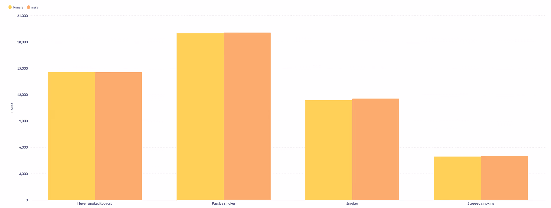 A simple bar chart can show how smoking habits differ across genders—for example, revealing that a higher percentage of males report being current smokers. Visuals like this make it easy to spot population-level patterns and guide targeted interventions.