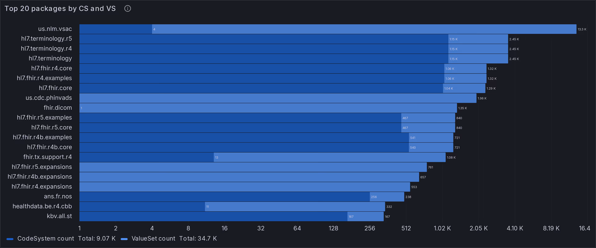 We downloaded 2,357 different packages from the registry, representing 468 unique package names and their versions. As shown in Fig 1 (note that we're using a logarithmic scale), the package with the largest number of terminology resources was, by far, us.nlm.vsac, mostly comprised of ValueSets; followed by hl7.terminology.* and hl7.fhir.**.
