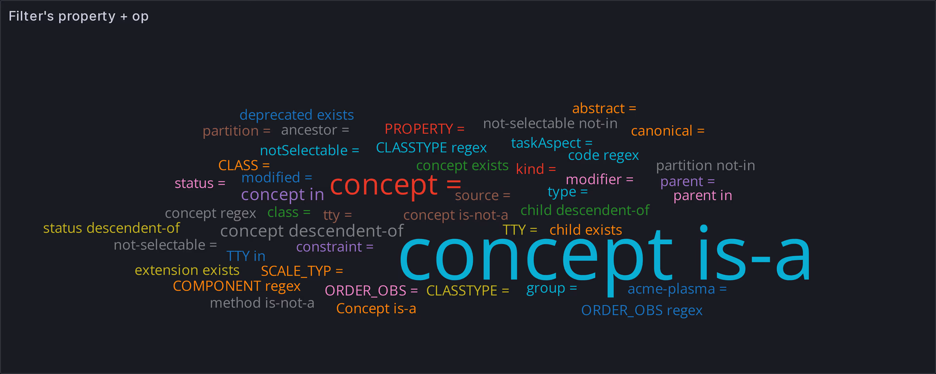 Value sets can use the set of base filters defined for all code systems as well as any additional filters defined in CodeSystem.filter. In Fig 10 we can see that the most commonly used filter + op combination is, unsurprisingly, concept is-a , since it's an easy way of leveraging the hierarchical nature of many terminologies.