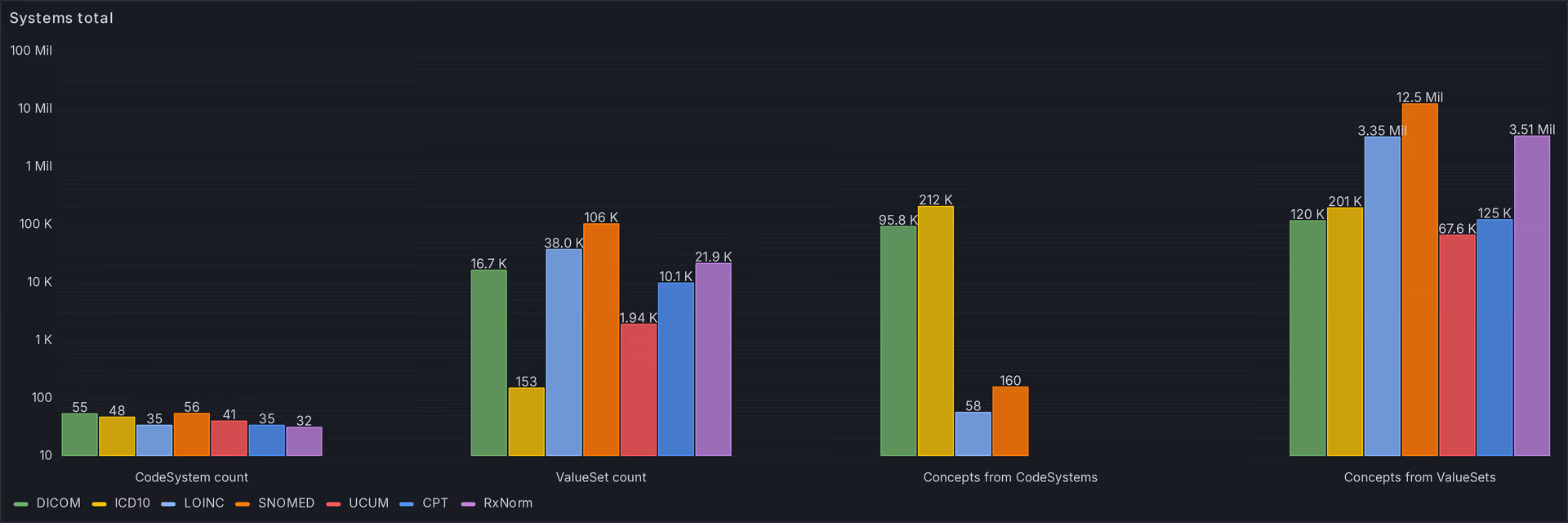 We also analyzed some of the most popular code systems in order to find insights on patterns and use cases. In Fig 11 we can see a comparison of totals, please notice that we're using a logarithmic scale [13].