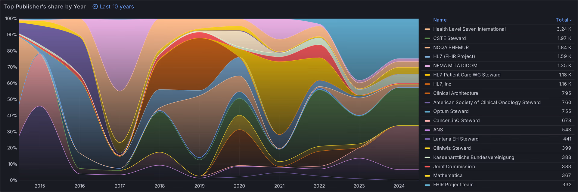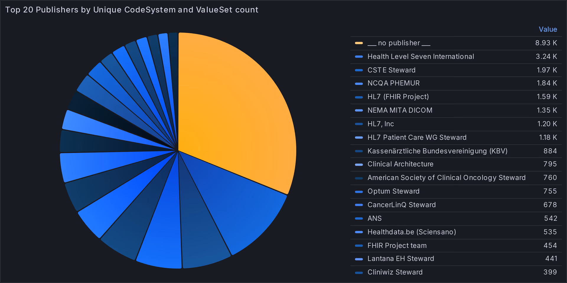 Most resources don't have a publisher name, among the ones who do, HL7 is the top publisher, although the naming is not always consistent, see Fig 2.