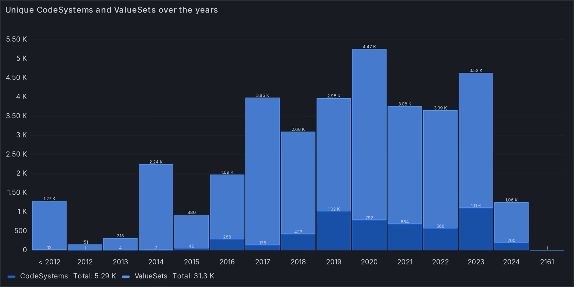 As our data source, we used the FHIR package server [1]. We downloaded all available packages, extracted the terminology-related resources [2], and loaded them into a Postgres database. For visualization purposes, we created Grafana dashboards, which are included in the appendix. This analysis was conducted on June 14, 2024.