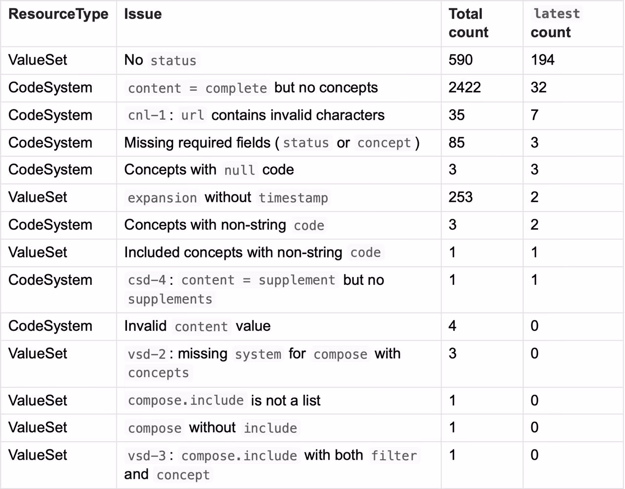 Our analysis of the FHIR terminology data revealed several data quality issues that could impact the usability and reliability of these resources. These issues make it harder for implementers to reliably support operations such as validation, lookup, expansion, etc. Here, we outline some of the primary issues we encountered.