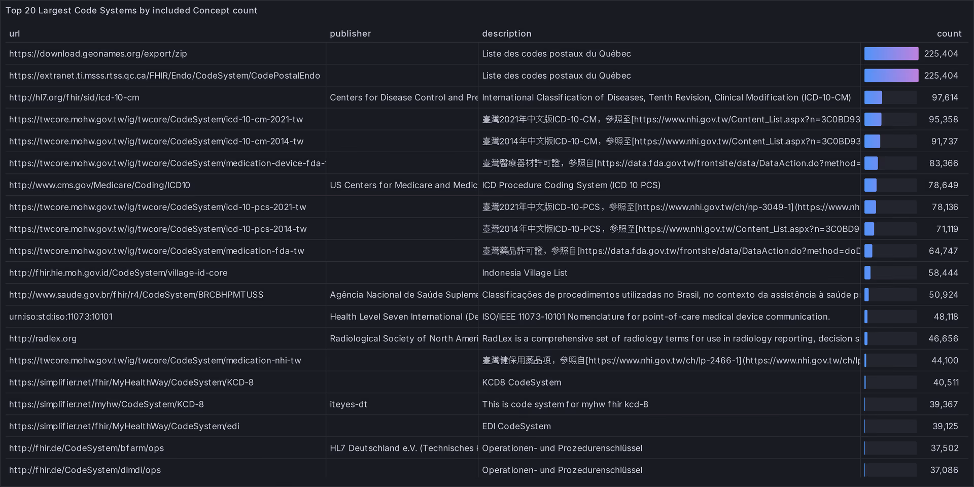 In Fig 5 we can see that, from the code systems that explicitly list their concepts, most of the largest ones are compendiums of geographical data, the largest one being Quebec's postal codes with over 200k concepts, followed by a few versions of ICD10.