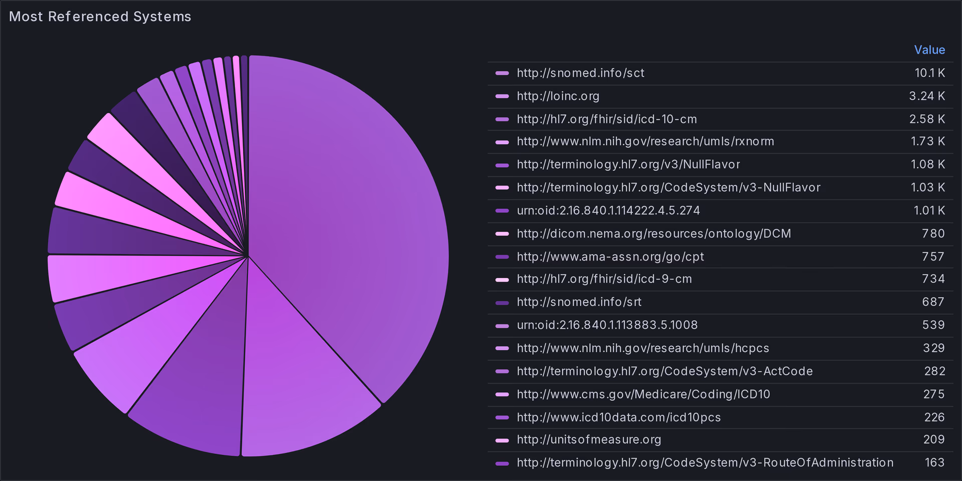 In this section, we explore the quantitative aspects of the FHIR terminology dataset, examining totals, distributions, and patterns.