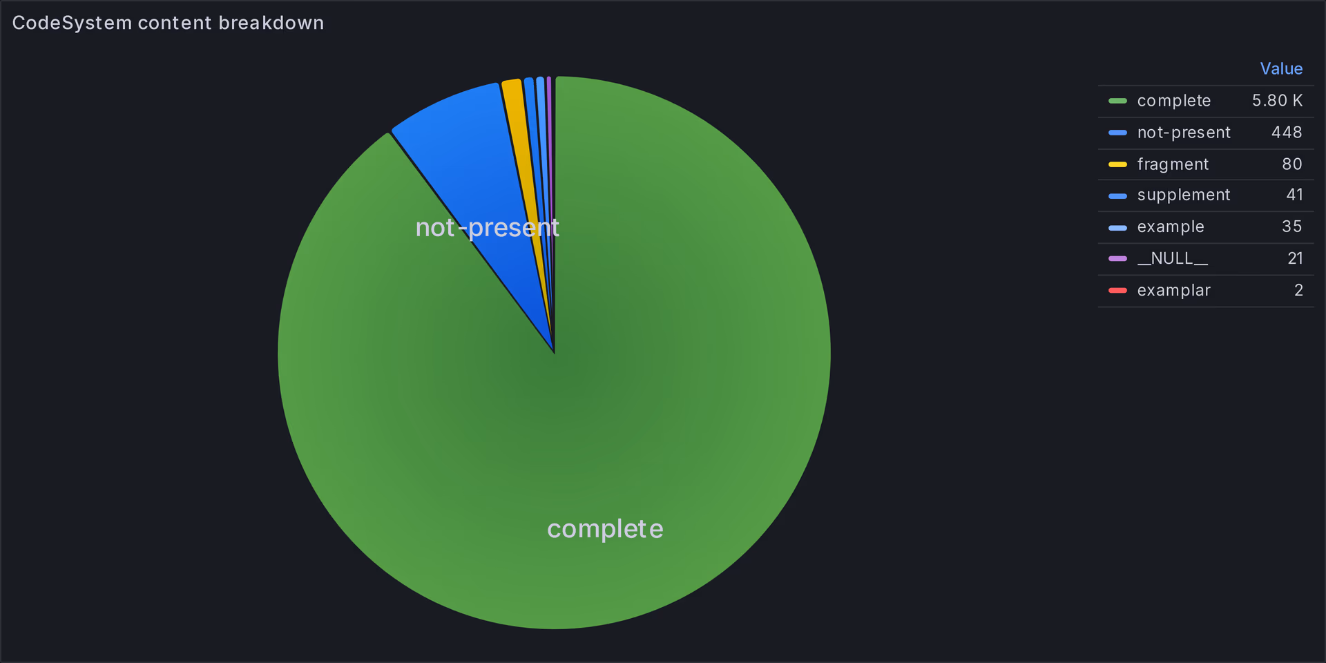For many of these code systems it's impractical to list their concepts explicitly in the resource definition, that's why most of them just list not-present and it's up to the implementer to provide an indexed source to serve requests. In Fig 12 we can see that the only complete code systems are ICD-10 and DICOM (SNOMED shows up in the chart as complete but it's not actually there, it's an error in some of the CodeSystem resources)