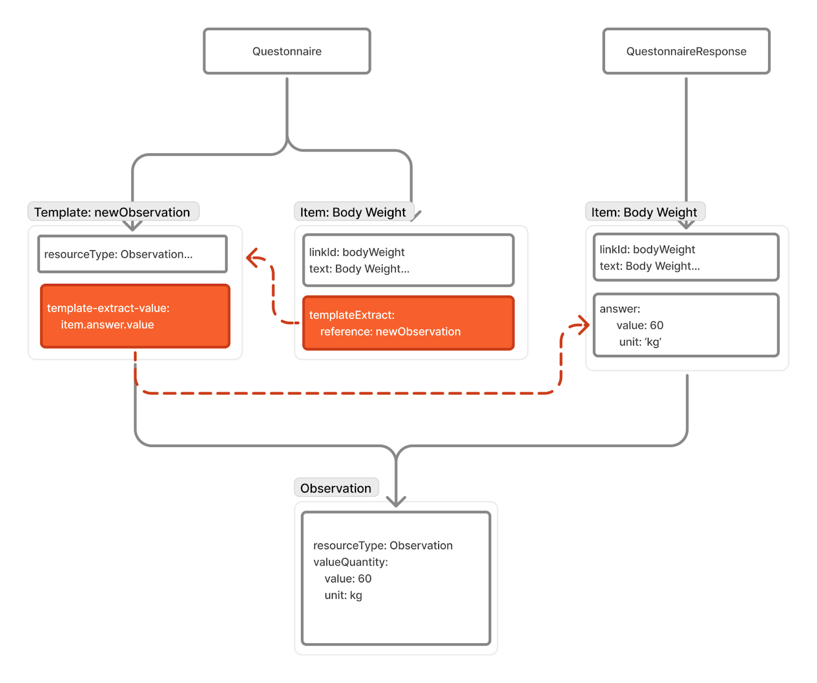 By embedding resource or Bundle templates directly within the Questionnaire (as contained resources) and annotating them with simple FHIRPath-driven templateExtractContext and templateExtractValue extensions, authors can precisely define: