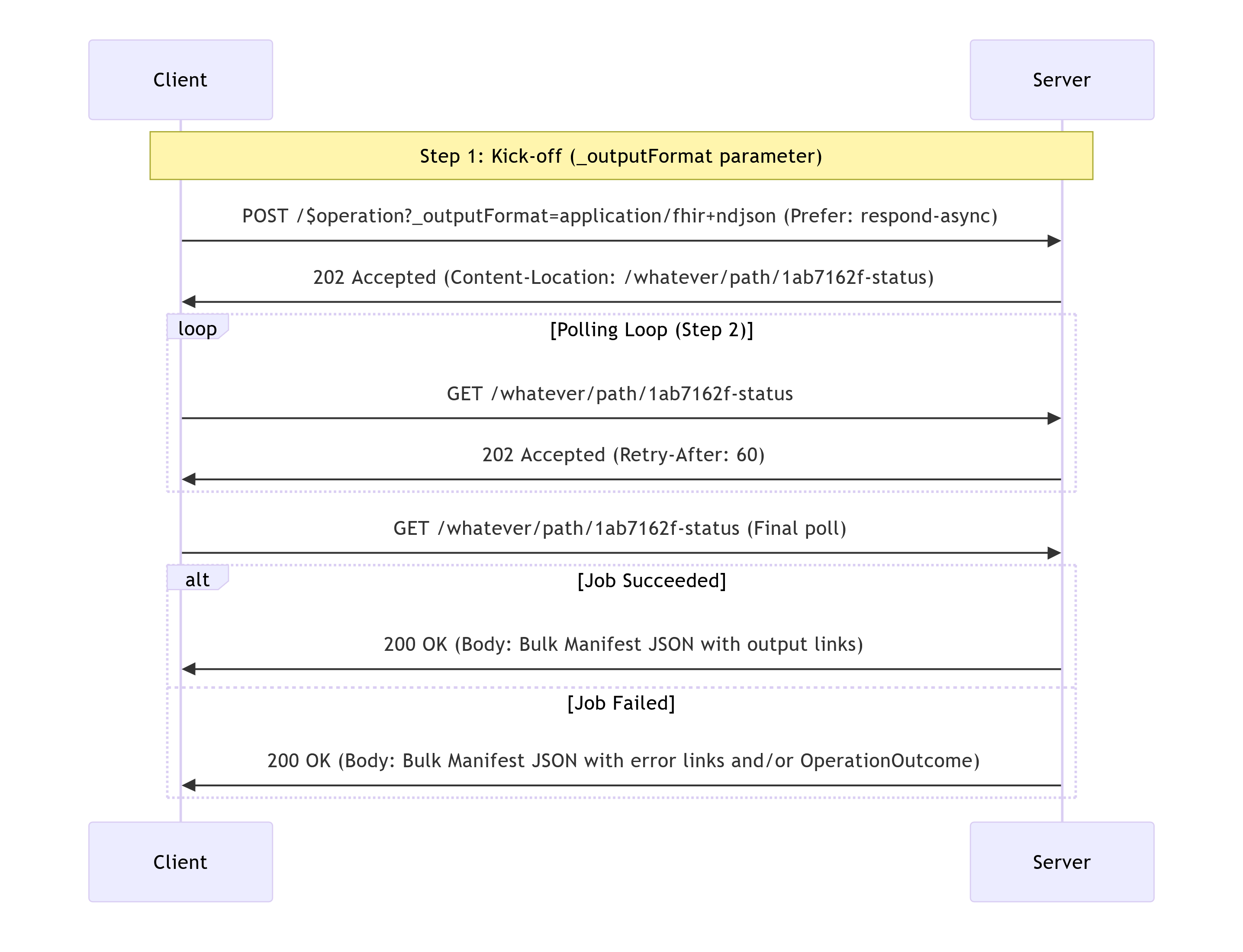 Ideally, we can unify these patterns into a single parameterized one. Use Prefer: respond-async plus a custom Prefer token to request the mode. For backward compatibility the default is bundle; if _outputFormat is present, treat the request as Bulk and return a manifest (servers MAY reject a conflicting async-mode with 400 Bad Request).