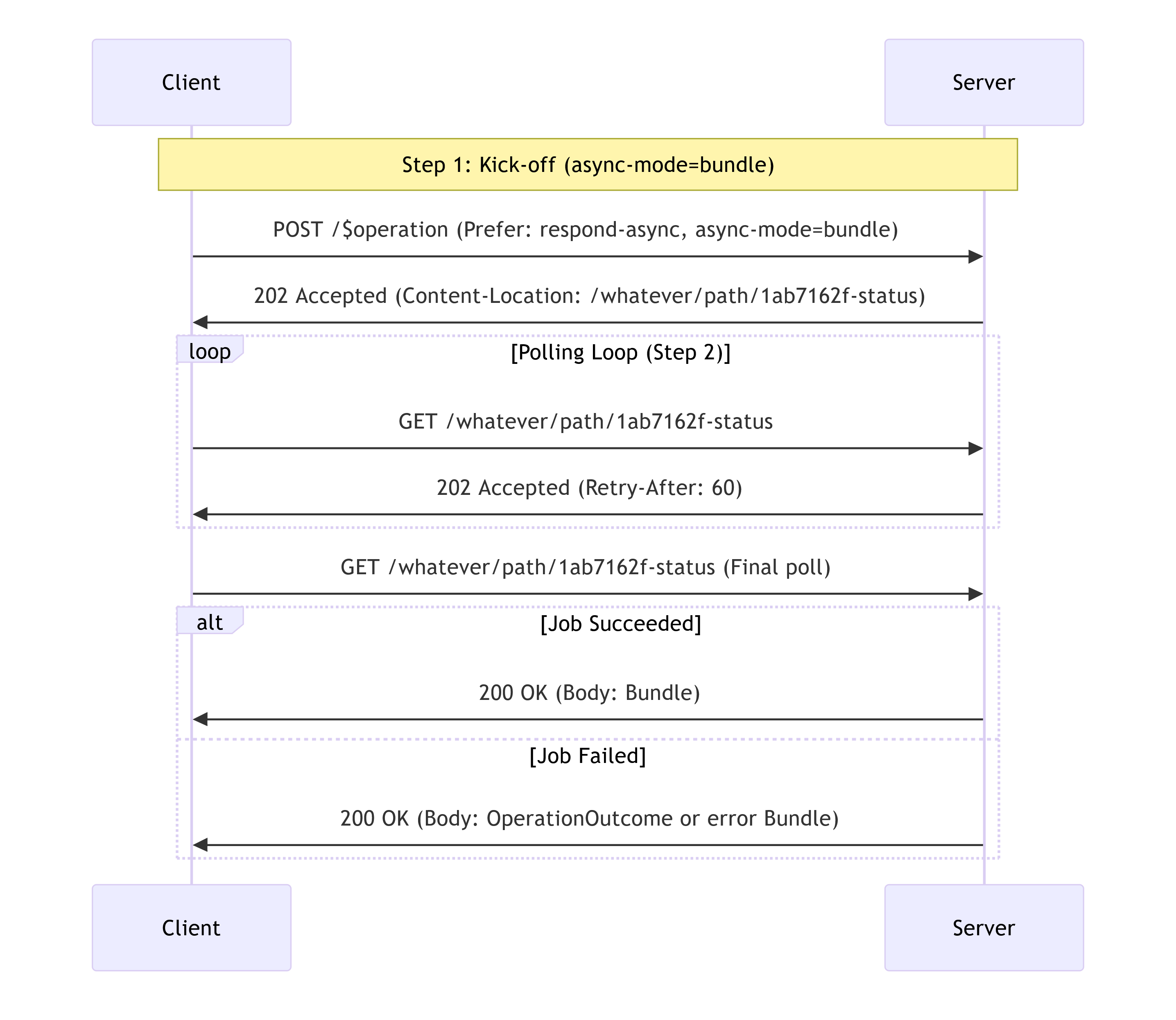 async-mode=bundle: server SHOULD respond with 200 OK and a Bundle body; failures use an OperationOutcome payload.