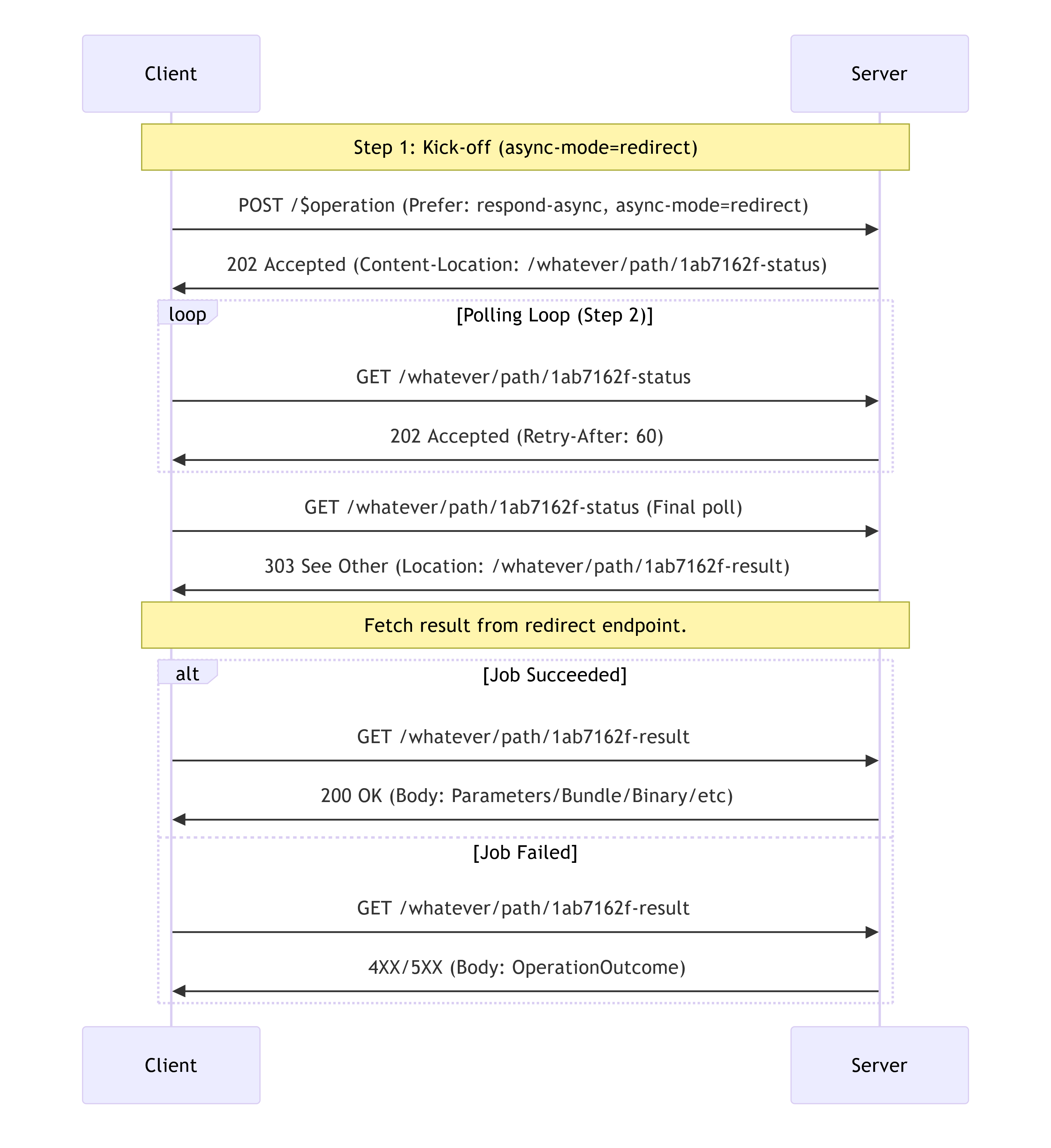 Clients can infer completion and the mode from the status code (200 or 303); success vs. failure depends on the final payload or the redirected response status.