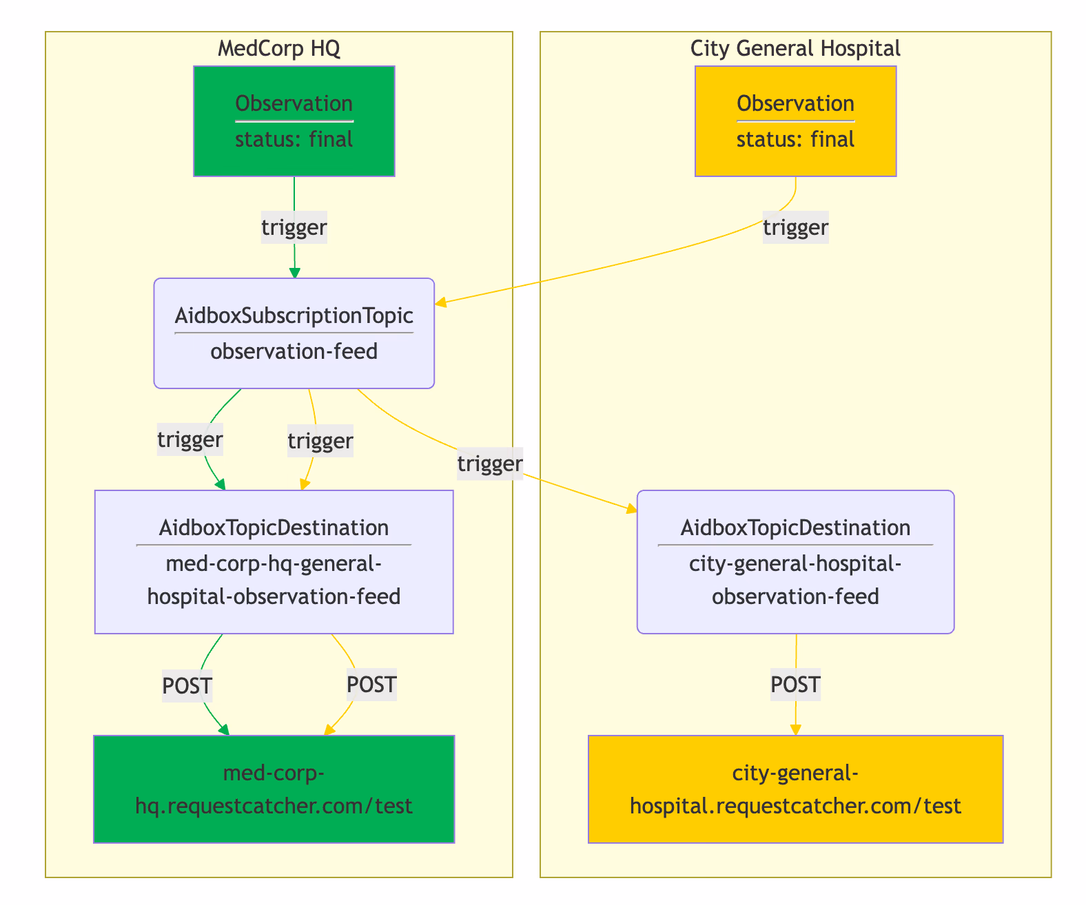Check that http://med-corp-hq.requestcatcher.com and https://city-general-hospital.requestcatcher.com should receive observation create events.