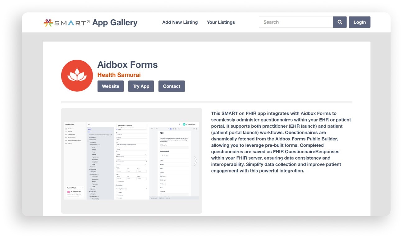 Aidbox Forms SMART App is now available in the SMART App Gallery, making it significantly easier to implement smart medical forms across major Electronic Health Record (EHR) systems.